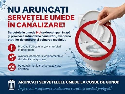 Stimați consumatori, în contextul exploatării sistemului de canalizare, constatăm tot mai frecvent apariția blocajelor cauzate de aruncarea necorespunzătoare a șervețelelor umede în rețeaua de canalizare.